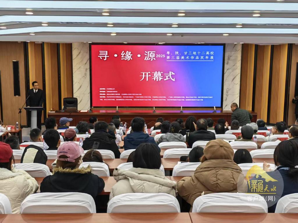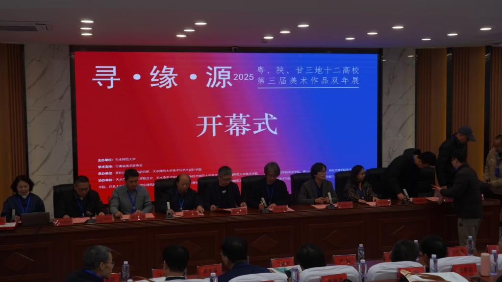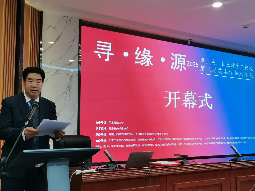 11月29日上午,由天水师范大学主办,麦积山石窟艺术研究所、天水师范大学美术与艺术设计学院承办的“寻·缘源”粤、陕、甘三地十二高校第三届美术作品双年展暨学术研讨会在我校举行。学校党委领导、职能部门负责人与来自西安文理学院、广东技术师范大学、西北大学、西北师范大学等十二所高校的美术与设计方面的专家学者、师生代表齐聚一堂,共赴这场艺术与学术的双重之约。开幕式由学校副校长左国防主持。