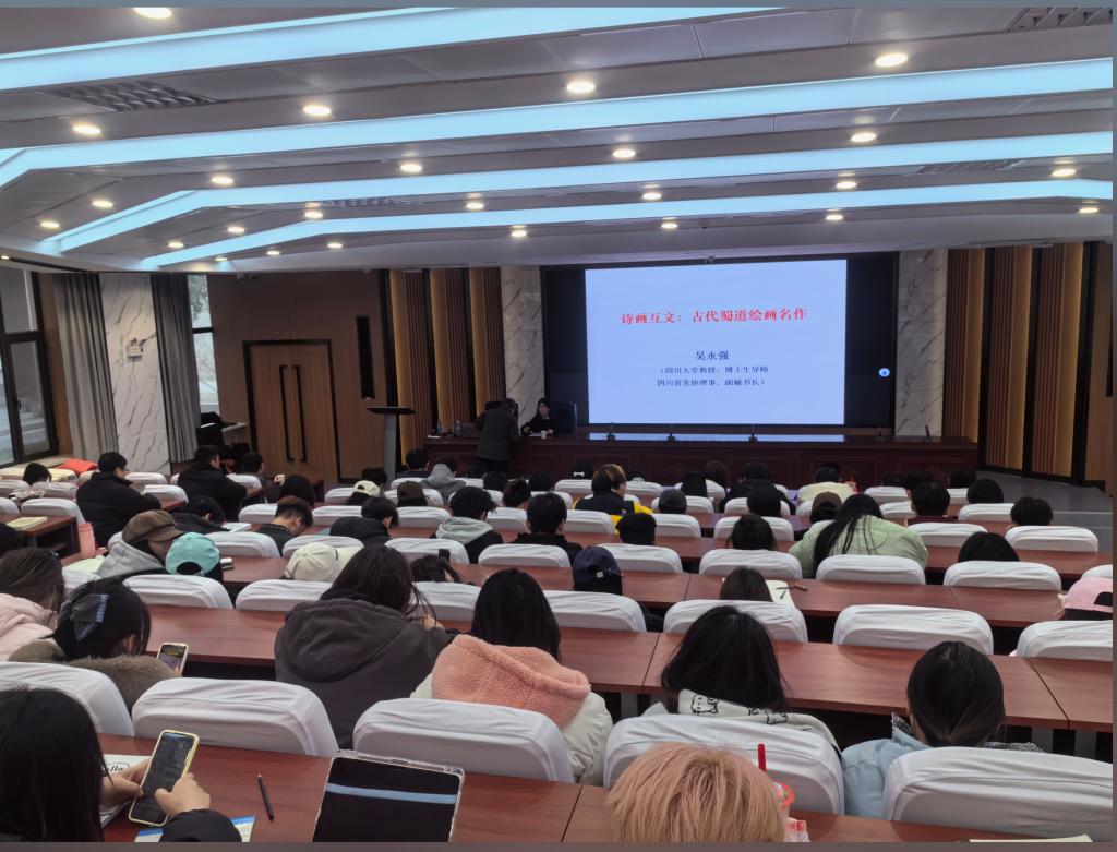 2025年12月25日下午15:00,天水师范大学美术与艺术设计学院特邀四川大学教授、博士生导师吴永强教授做学术报告,一场主题为《诗画互文——古代蜀道绘画名作》的学术讲座在1号报告厅内顺利举行,现场座无虚席。本次讲座由天水师范大学美术与艺术设计学院康小花教授主持,美术学院150余名师生到场聆听学习。