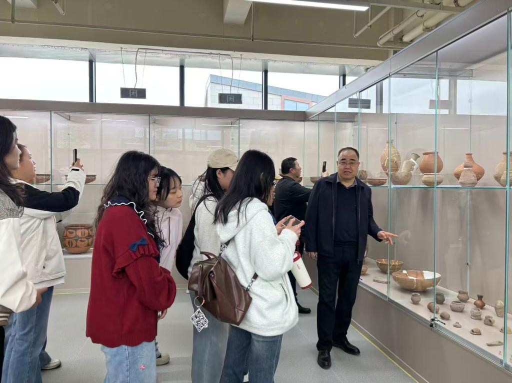 此展览围绕甘肃彩陶从大地湾、仰韶到马家窑文化的发展脉络,主要呈现了精美的彩陶文物、工艺标本与文创作品等。学生们认真观摩器物造型、纹饰技法与制作流程,深入探讨史前艺术审美、工艺传承及当代文创产品转化路径。展馆负责人结合历代陶器展品作了详细的讲解,引导学生在今后学习中要将地域文化资源与美术教学、创作实践相结合。