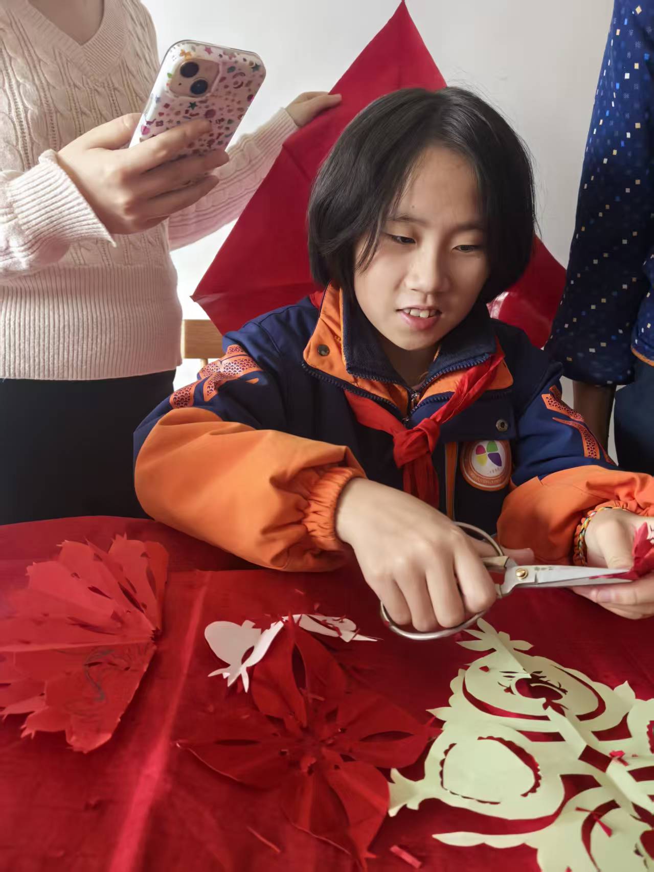 不少家长带着孩子参与,看着自家孩子在小苗子的指导下完成人生第一幅剪纸,感慨道:“这种同龄人教学的方式太奇妙了,孩子学得认真,也感受到了传统文化的乐趣。” 活动现场,小苗子们还展示了平时在工坊学到的进阶技艺,如多层团花、立体剪纸等,精湛的手艺让居民们啧啧称奇,更激发了大家对非遗文化的热爱。