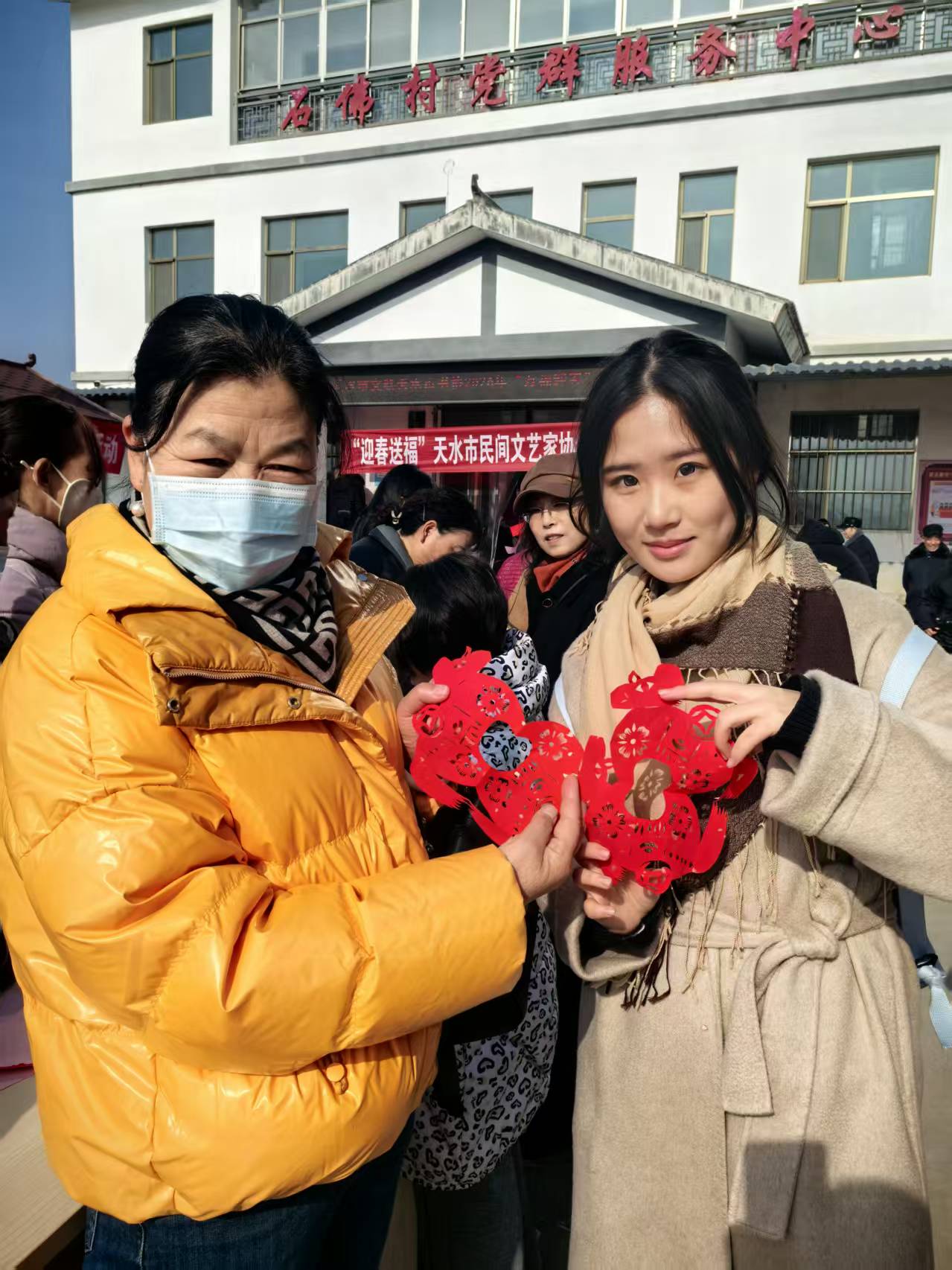 2 月 4 日立春当日,在党支部统筹协调下,秦风里工坊参加了天水市民间文艺家协会“万福迎春”公益活动,走进麦积区石佛镇石佛村。活动现场,工坊老中青三代人一起上阵,红纸象晚霞一样铺展开来,剪刀如燕子一般灵巧翻飞,一张张精彩绝伦的窗花在灵巧的双手中诞生。薄岚老师的传统花鸟团花剪纸线条细腻,图案饱满,尽显专业功底;贾雨蓓的“马上发财”“一马当先”表达着对生肖马年的深情祝福。12 岁的非遗小苗子创作的葫芦剪纸,寓意“福禄”,饱含着中国年的幸福诉求。此次活动共为石佛村剪了 80 余幅精品剪纸,让村民在家门口感受到党建引领下的非遗魅力,为乡村年味增添浓郁文化气息。
